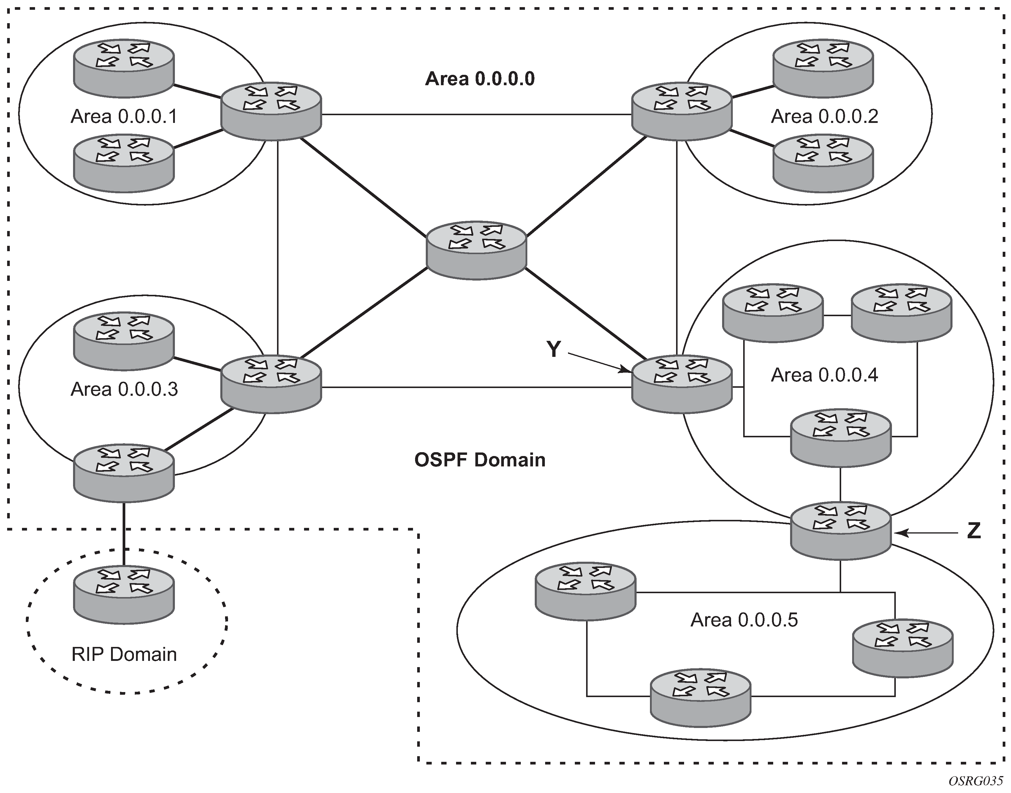 The OSPF backbone area, area 0.0.0.0, must be contiguous and all other areas must be connected to the backbone area. The backbone distributes routing information between areas. If it is not practical to connect an area to the backbone (see Area 0.0.0.5 in Figure: OSPF areas) then the area border routers (such as routers Y and Z) must be connected via a virtual link. The two area border routers form a point-to-point-like adjacency across the transit area (see Area 0.0.0.4). A virtual link can only be configured while in the area 0.0.0.0 context.