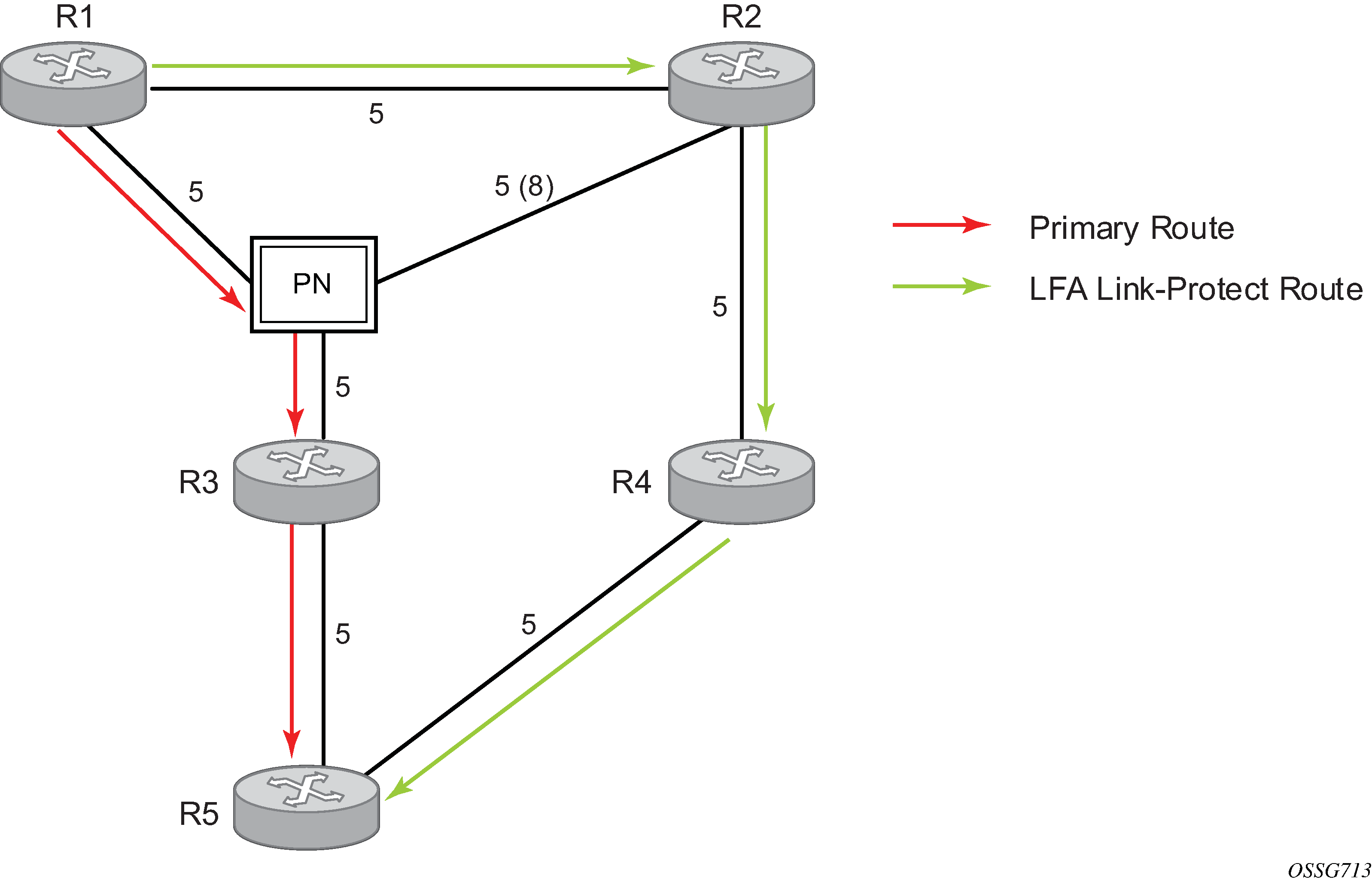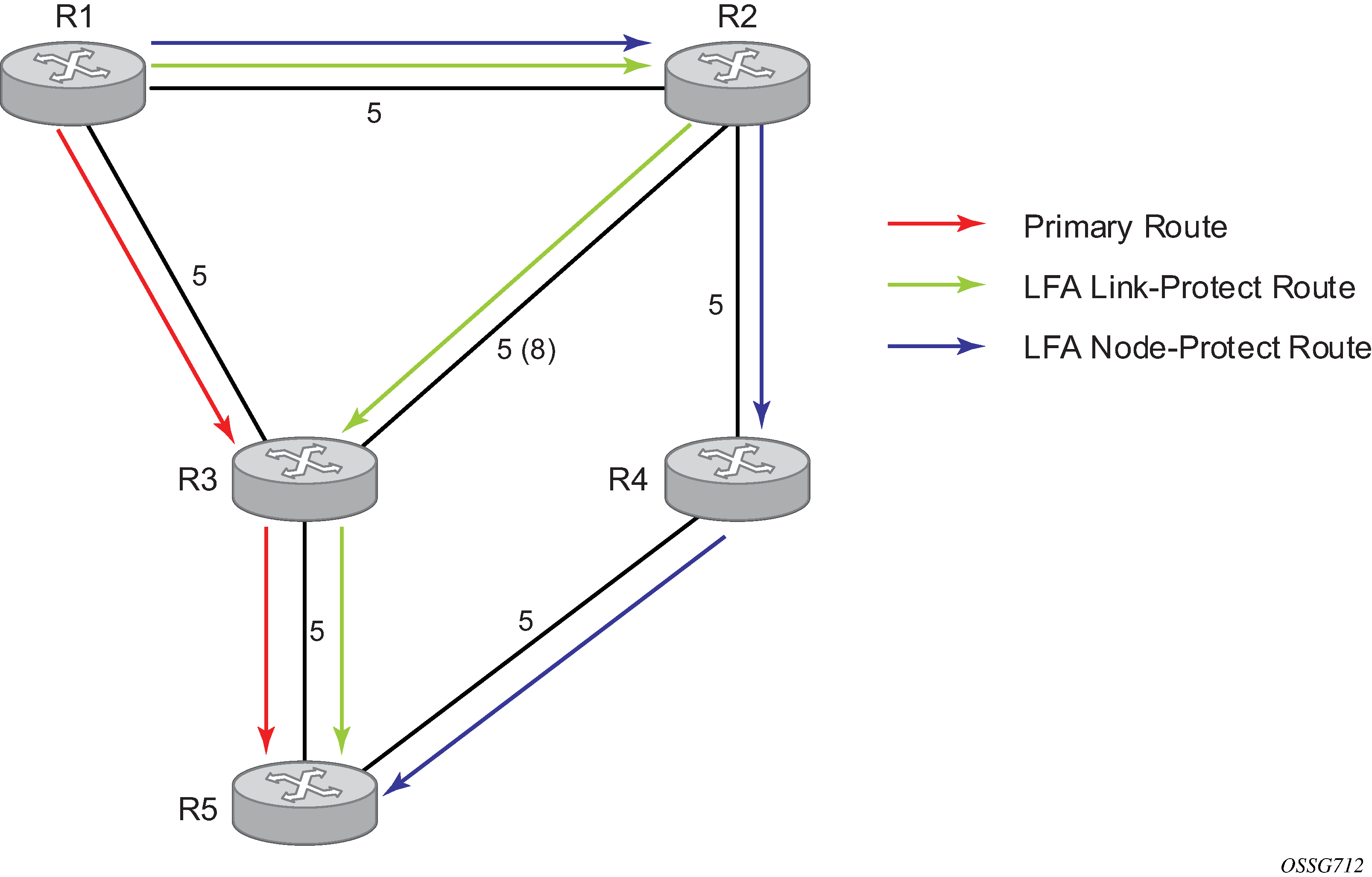 The primary route is via R3. The LFA route via R2 has two equal cost paths to reach R5. The path by way of R3 protects against failure of link R1-R3. R1 computes this route by checking that the cost for R2 to reach R5 by way of R3 is lower than the cost by way of routes R1 and R3. This condition is referred to as the Loop-free Criterion (LFC).