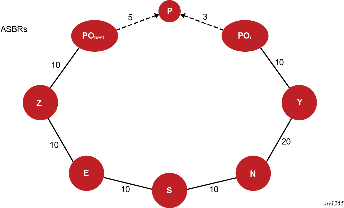 In the topology shown in Figure: Application of MHP LFA to IP FRR, prefix P has a dotted link with a metric of 5 to ABR or ASBR node PObest that summarizes the path in the remote OSPF area or instance to the best ABR or ASBR. Node PObest is ABR or ASBR that lies in the shortest path from the computing node S to the destination prefix P .