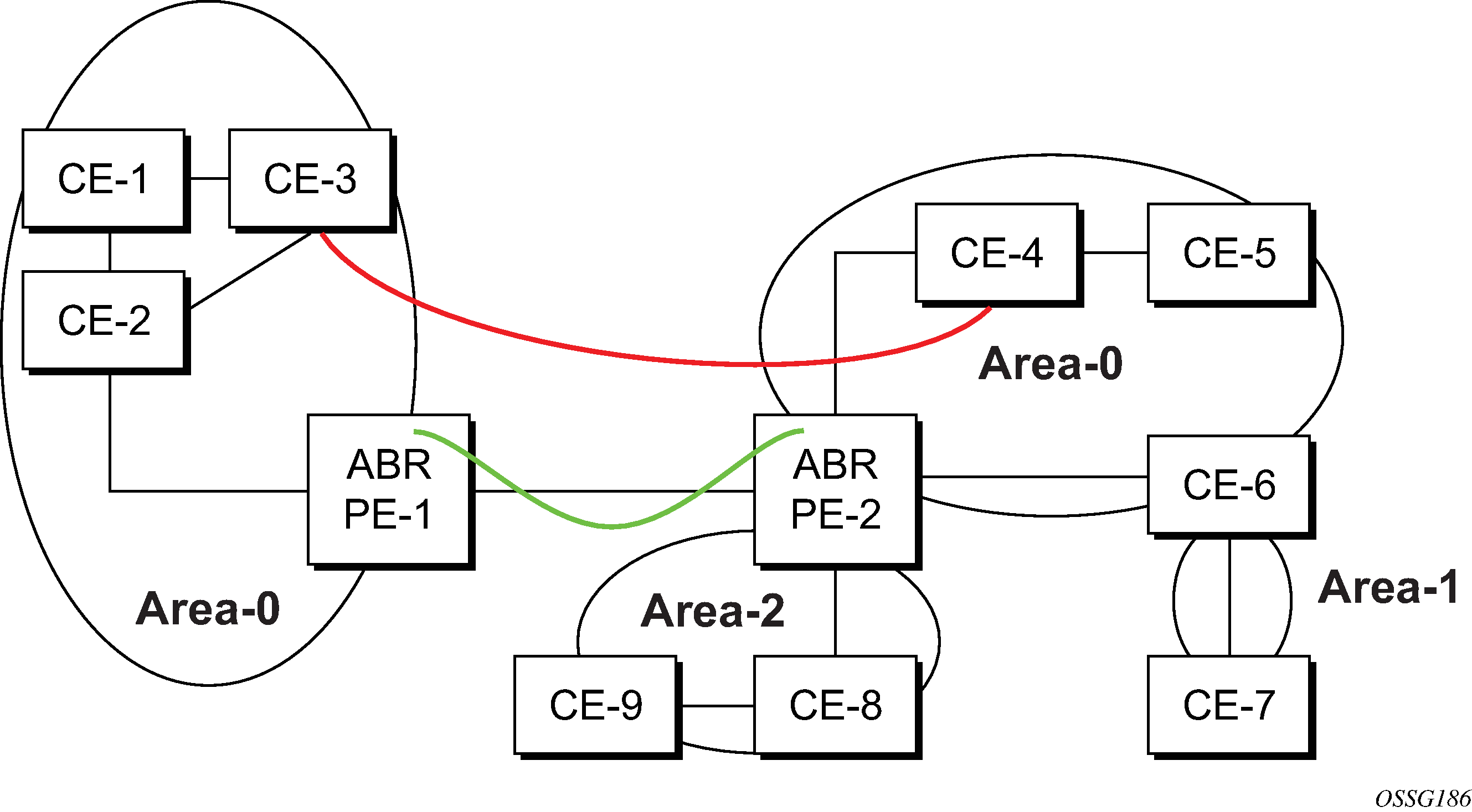 In Figure: Sham links, the red link between CE-3 and CE-4 could be a low speed OC-3/STM-1 link, but because it establishes an intra-area route connection between the CE-3 and CE-4, the potentially high-speed PE-1 to PE-2 connection is not used. Even with a super backbone configuration, it is regarded as an inter-area connection.